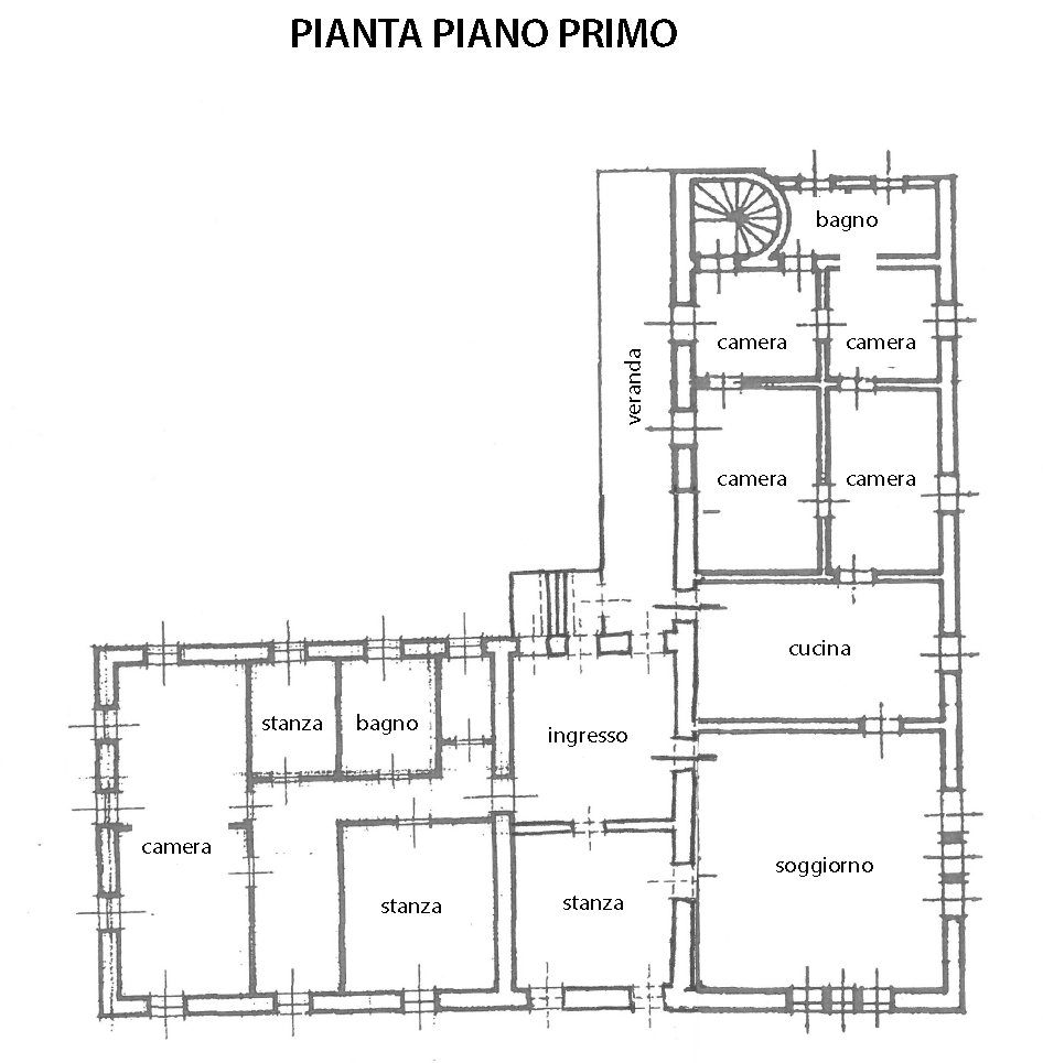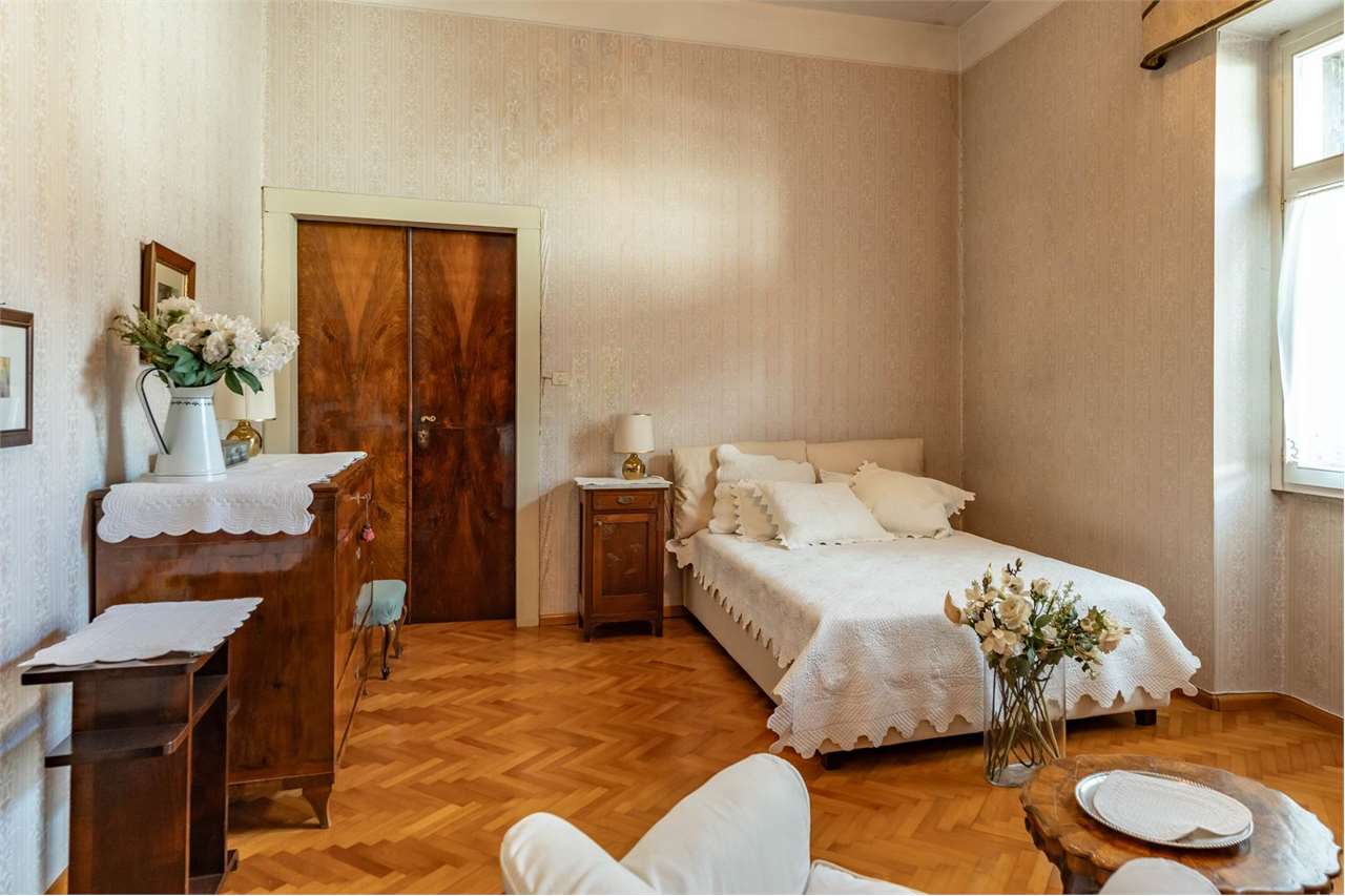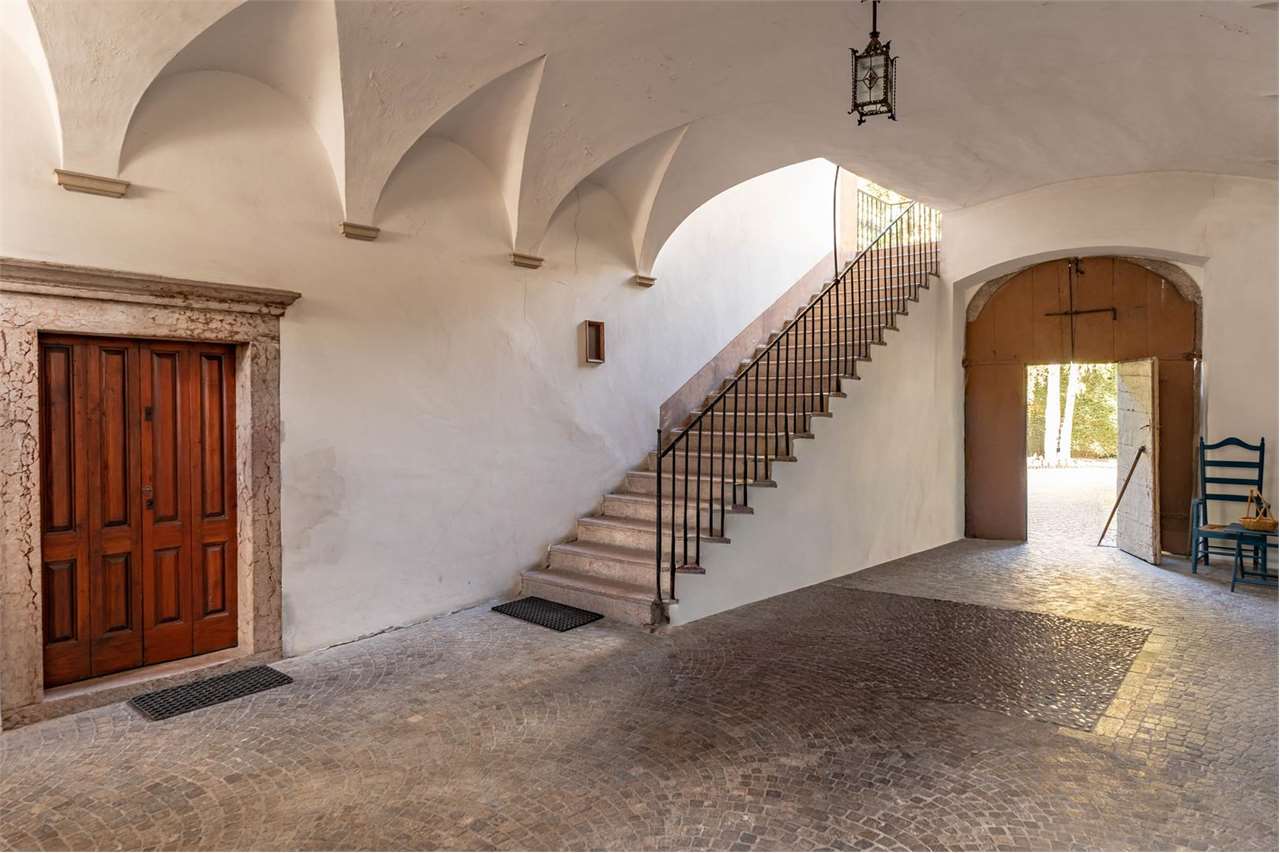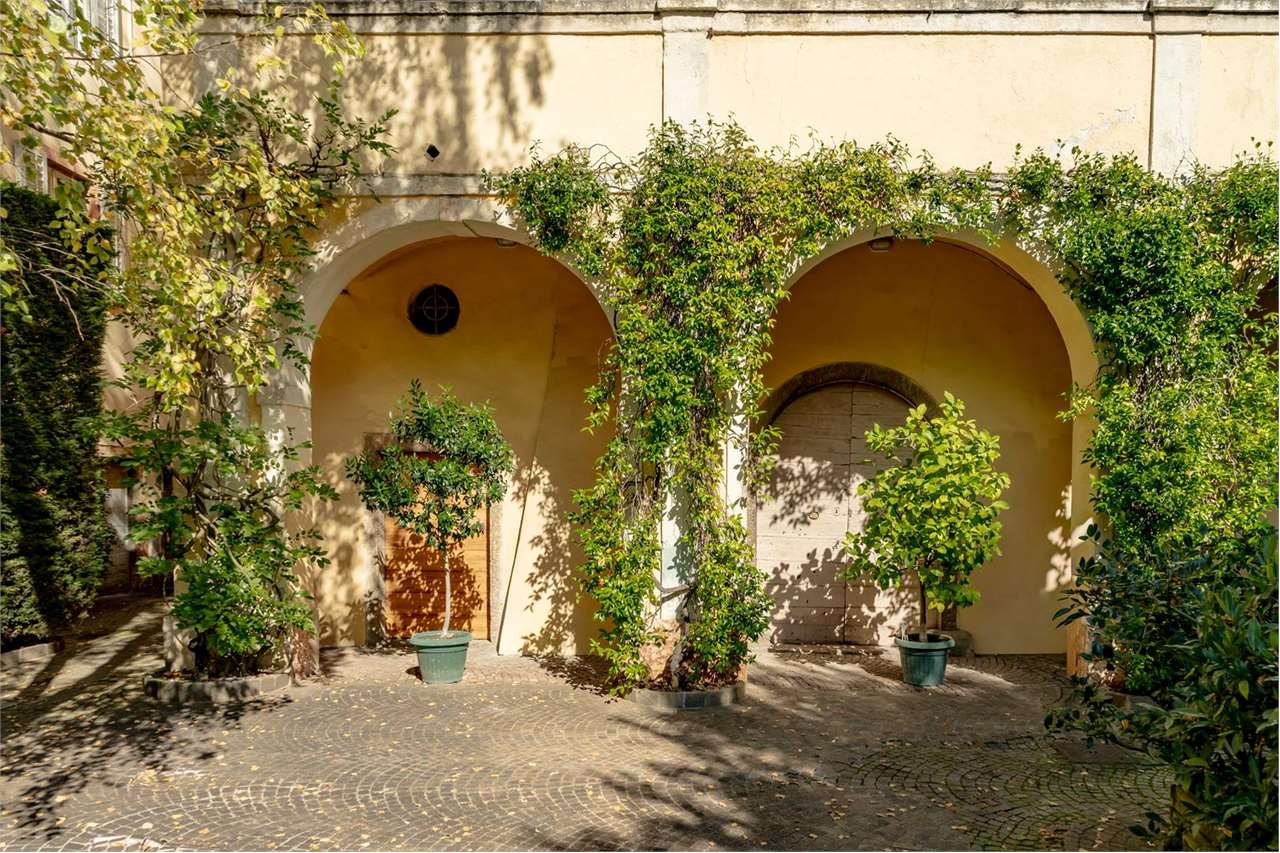 Al piano terra si accede tramite un ampio cortile che suddivide idealmente la residenza in due ali distinte. L’ingresso principale, situato al primo piano, conduce all’interno di una residenza di grande pregio, caratterizzata da elementi storici e dettagli raffinati. La parte più antica comprende quattro camere da letto, un bagno molto spazioso, una cucina di ampie dimensioni, una sala da pranzo e un salotto decorati con eleganti affreschi su pareti e soffitti. La loggia, affacciata sul giardino, permette l’ingresso di luce naturale, valorizzando ulteriormente questa zona della casa.