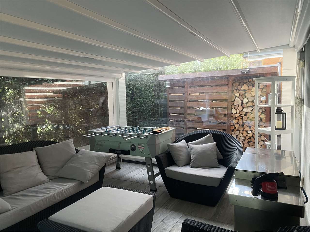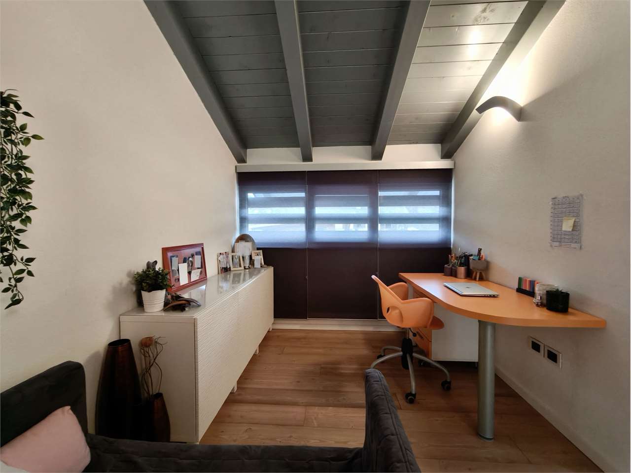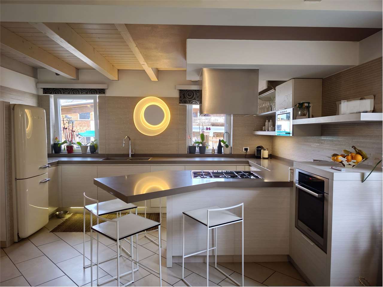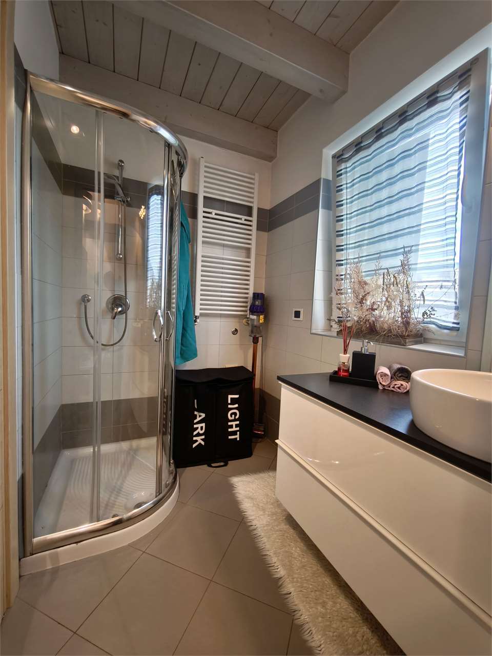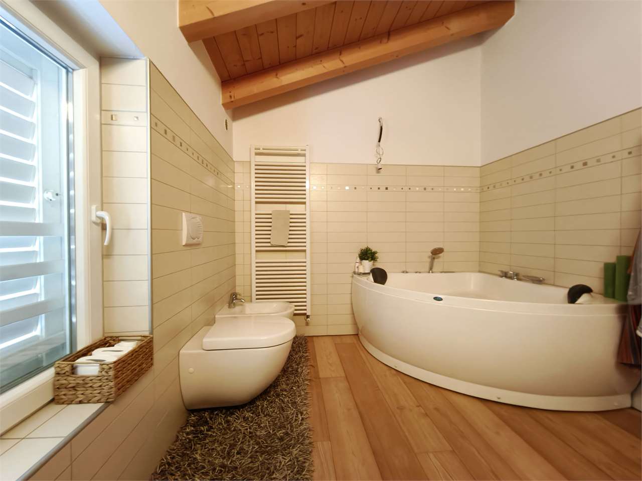 La superficie complessiva è di circa 220 mq, distribuiti armoniosamente sui tre piani, tutti collegati da una comoda scala interna. Al piano terra troviamo un accogliente ingresso che conduce a un’ampia zona giorno composta da soggiorno con cucina a vista dal design moderno, un primo bagno finestrato e un elegante salotto con caminetto, reso ancora più luminoso dall’accesso diretto al giardino. La parte esterna della casa è stata valorizzata con una veranda coibentata, ideale per essere utilizzata durante la maggior parte dell’anno come estensione della zona giorno.